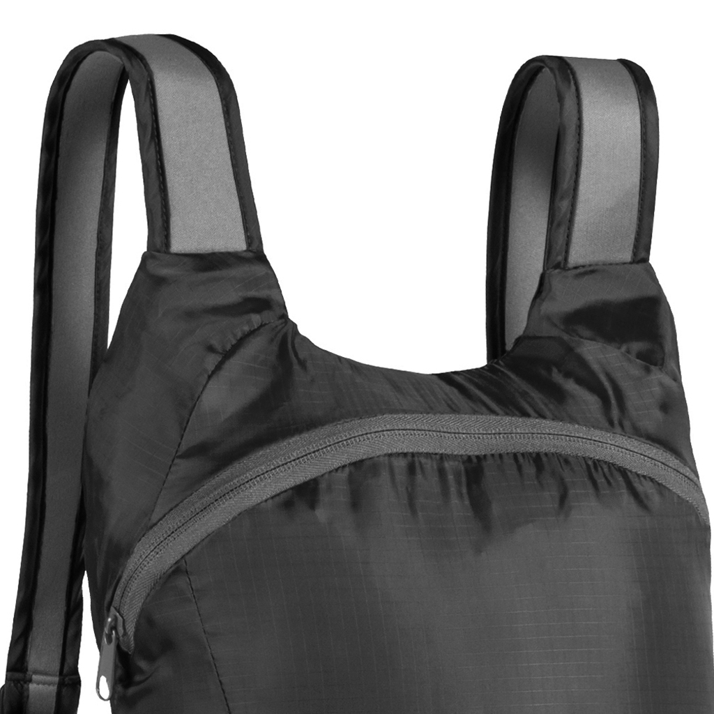 Faltbarer Rucksack mit Reißverschluss und verstellbaren Schultergurten. Praktisch verstaut in einem Beutel mit Karabiner und Trageschlaufe.